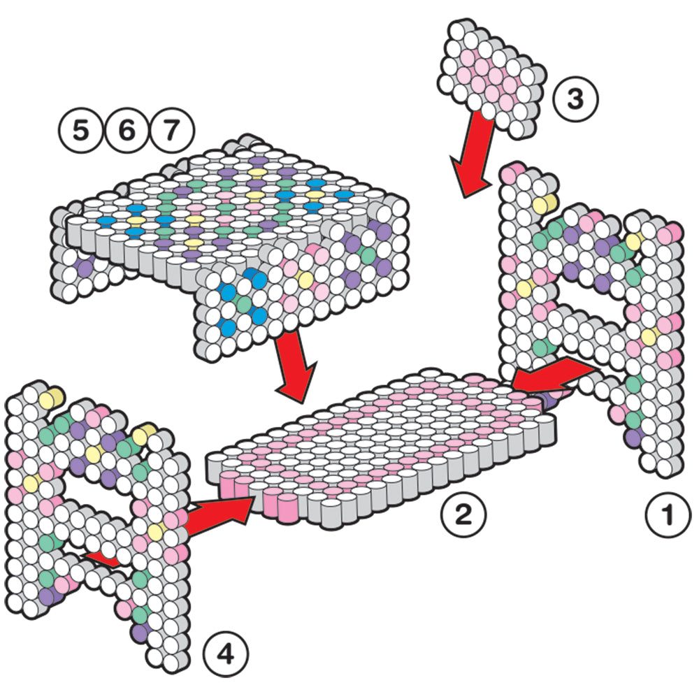 Shelf: Push the tabs of the three shelves into the slots on the side pieces. Place the top and bottom pieces in a similar manner. Add the back piece to the assembled shelves.