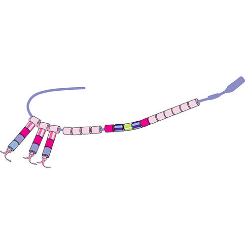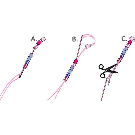 B. Loop your floss around the Light Pink bead then back down through the others. The Light Pink bead should be positioned horizontally over the remainder of the dangle as shown in the pattern.