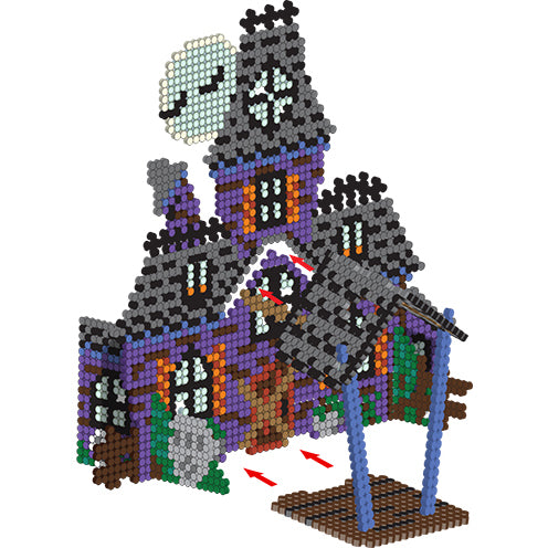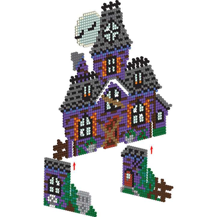 Download the PDF for the Haunted House Project Pattern. You will need 4 large square pegboards for your projectŃassemble the boards in a square. Cut out the individual pattern quadrants and tape them together so that you can see the whole design at once. If you're using clear pegboards, slide the actual-size pattern underneath them. Now place the beads for your project.