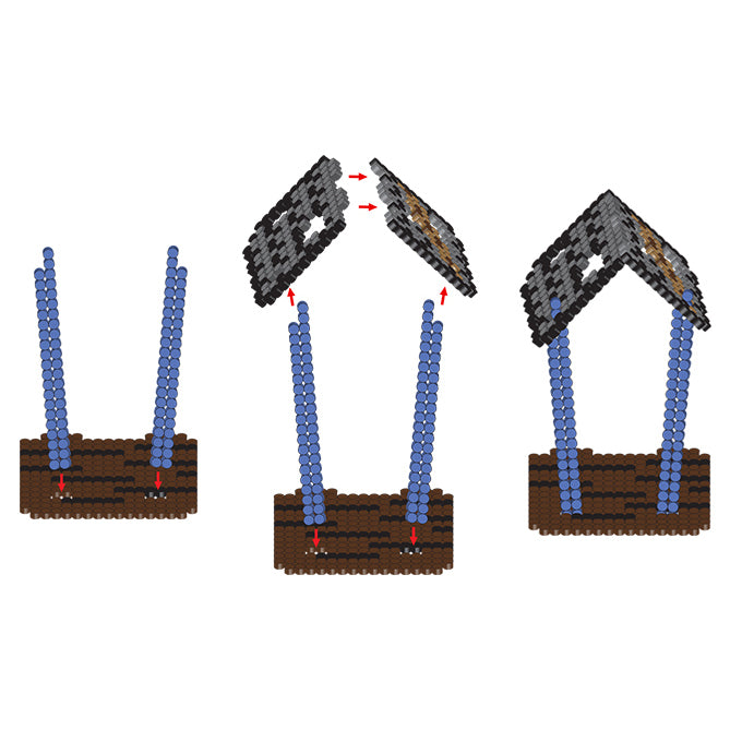 Insert the columns into the slots in the floor with the pointed ends up as shown. Connect the roof pieces at an angle, then insert the pointed ends of the columns into the small slots.