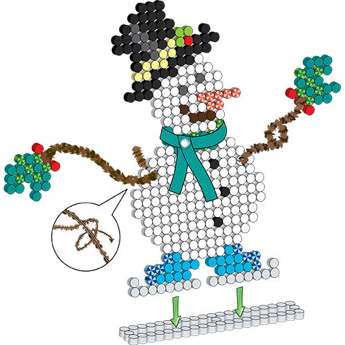Snowman: Twist light brown and brown pipe cleaners together for each arm. Attach arms through the beads in the body and mittens as shown, twisting to secure. Tie the scarf around the snowman's neck, and add an adhesive gem. Insert two round Snap-Ins for the eyes. Insert the snowman's skates into the base.