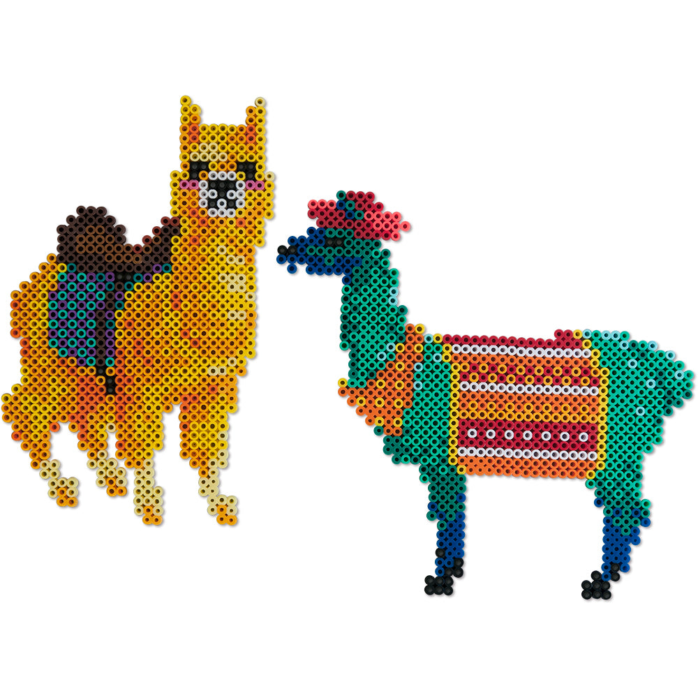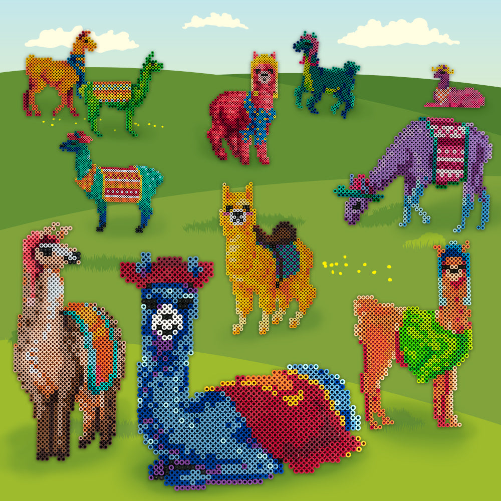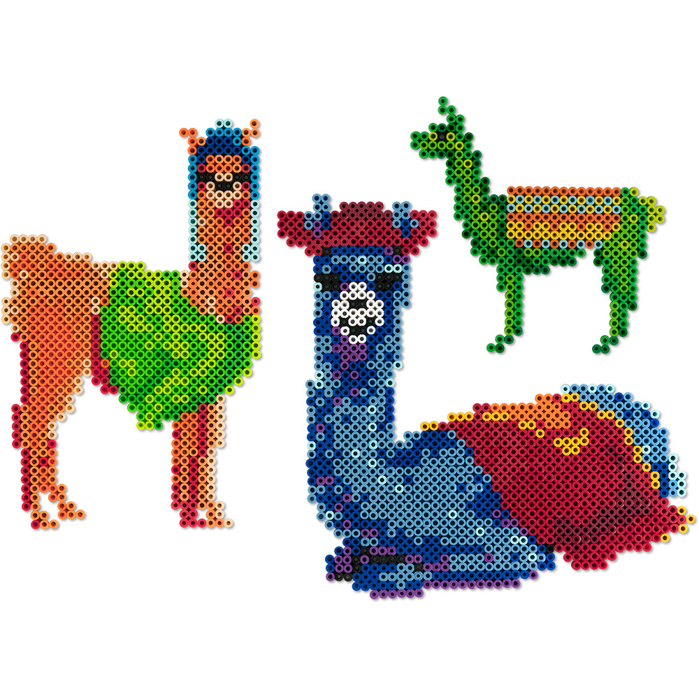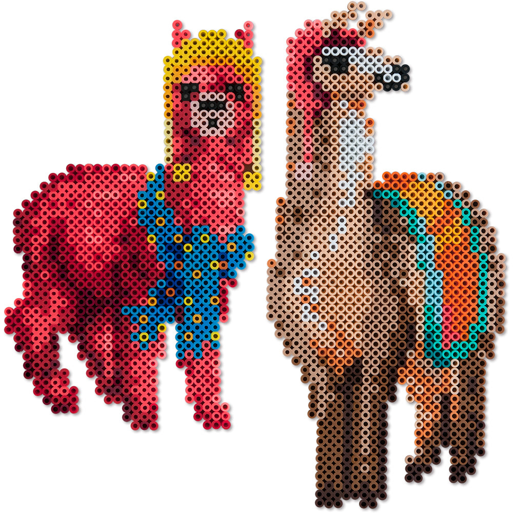 Download the PDF for the Lotsa Llamas Project Pattern. For the designs that require multiple pegboards, assemble the number as shown, placing them on one of the large pieces of cardboard on a heat-safe surface that you can later use for fusing. Cut out and tape together the pattern sections. If you are using clear pegboards, slide the actual-size pattern underneath them. Place your beads following the pattern.