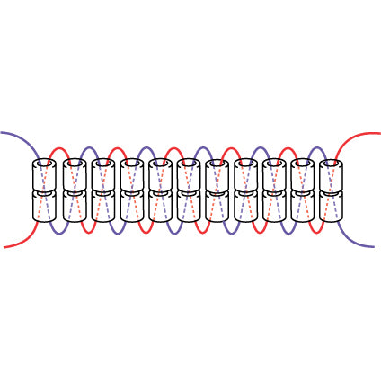 To make the purse strap, weave clear lacing through beads as shown (this illustration is expanded and lacing is red and blue to more easily show the lacing pattern used). Be sure to tie your string tightly. Leave extra lacing at the strap ends to attach them to the purse. Make the strap as long as you like.