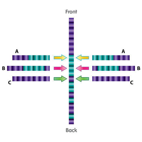 Insert the A pieces on either side of the head through the vertical slot A closest to the front of the head. The two A pieces will interlock. Repeat for the B pieces in the two B slots, and the C pieces in the four C slots.