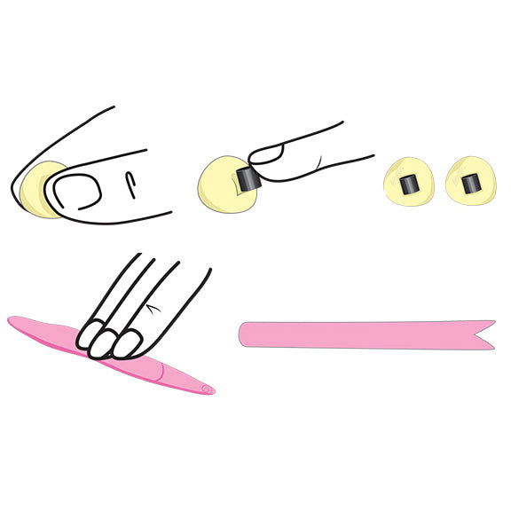 Use light yellow paper clay to create 2 spheres approximately 1/2 inch in diameter. Push a black bead halfway into the center of each of the spheres.