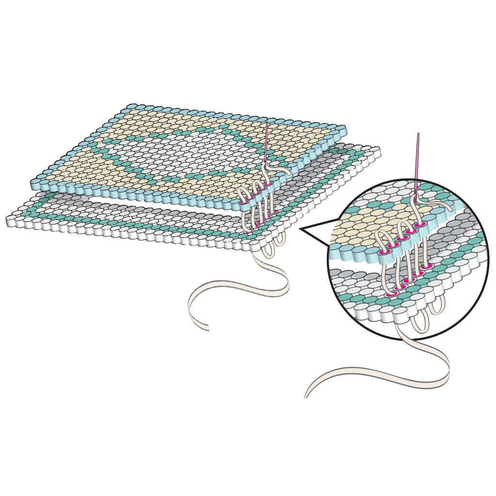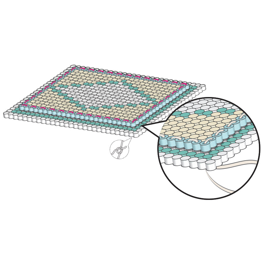 ASSEMBLY: Cut 35 inches of white embroidery thread or dental tape (more water-resistant) to stitch together the two parts of the lid as follows. Weave through the white beads of Part 1 and the toothpaste beads of Part 2 as shown. Continue all around the lid until you reach the starting point. Knot the ends together to secure, then trim away the excess.