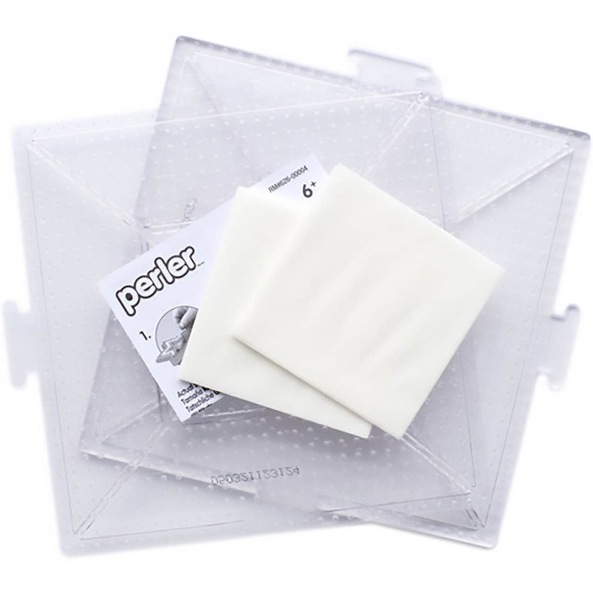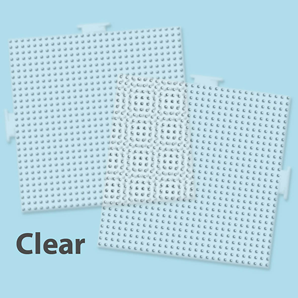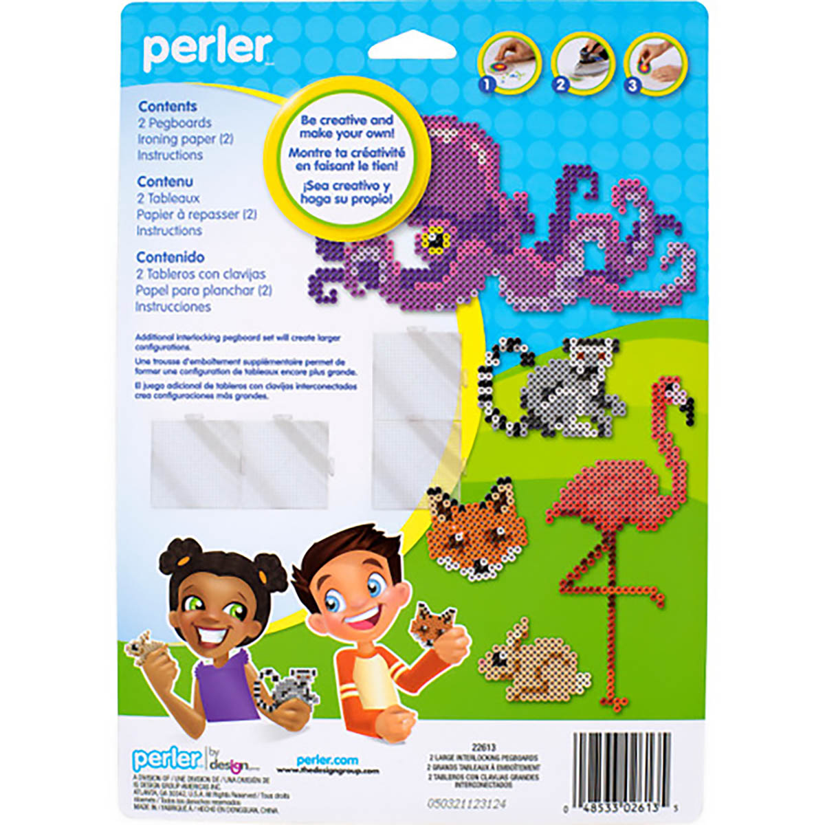 These large, clear, interlocking square pegboards are designed for use with Perler Beads, and can be joined together in multiples to create larger designs if desired. For ages 6 and up. The Perler Large Clear Square Pegboard set includes: