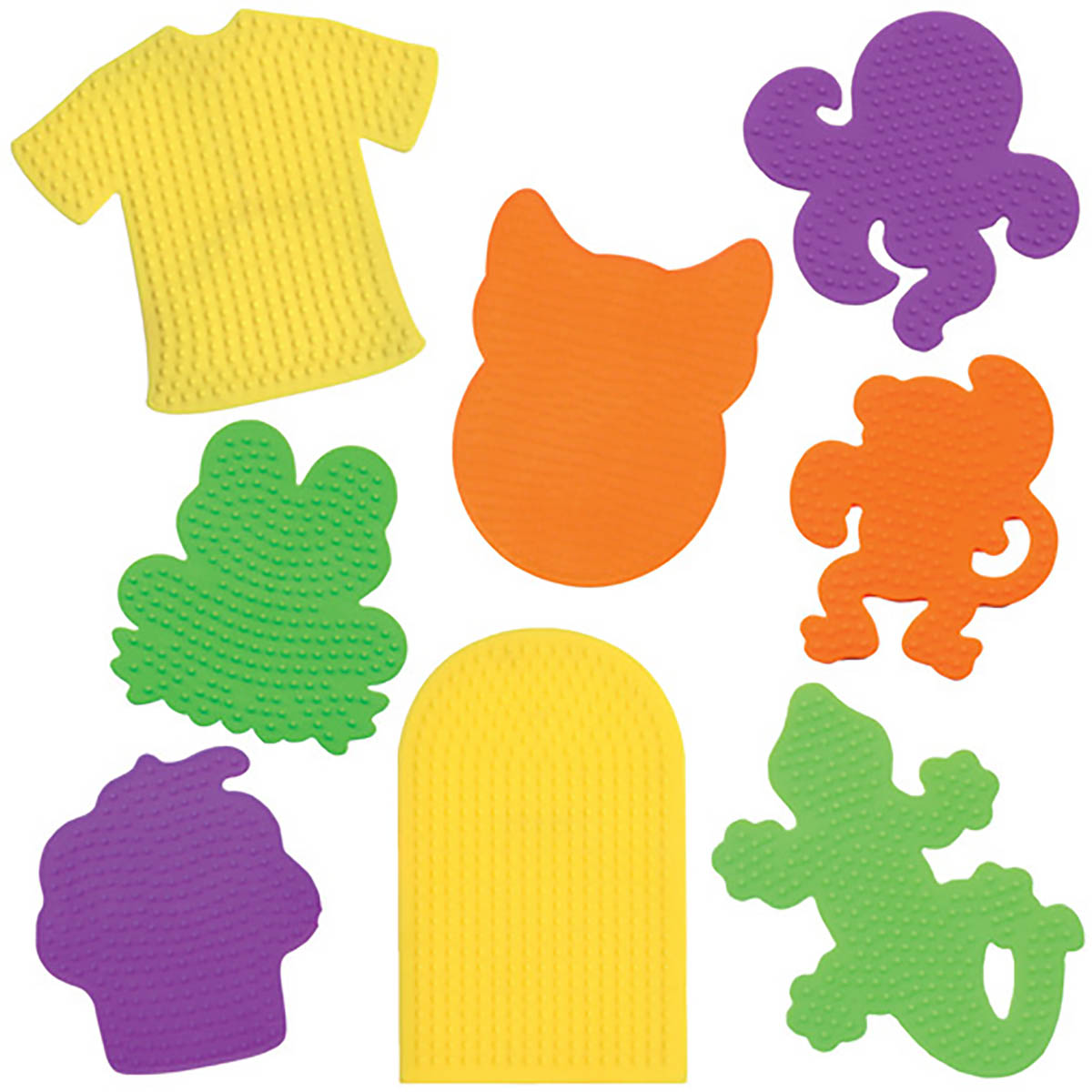 The Perler Pegboard Value Pack includes a great variety of pegboards in assorted colors that are designed for use with Perler Beads. Perfect for a rainy day or a birthday party activity! For ages 6 and up. The Perler Pegboard Value Pack includes these shapes—monkey: 3.5" x 4.1", octopus: 4.5" x 4.2", T-shirt: 5.5" x 5", owl: 3.75" x 4.875", frog: 3.75" x 4", cupcake: 3.75" x 4", arch: 3.63" x 5.88", and gecko: 5.6" x 4"—plus ironing paper and easy instructions.