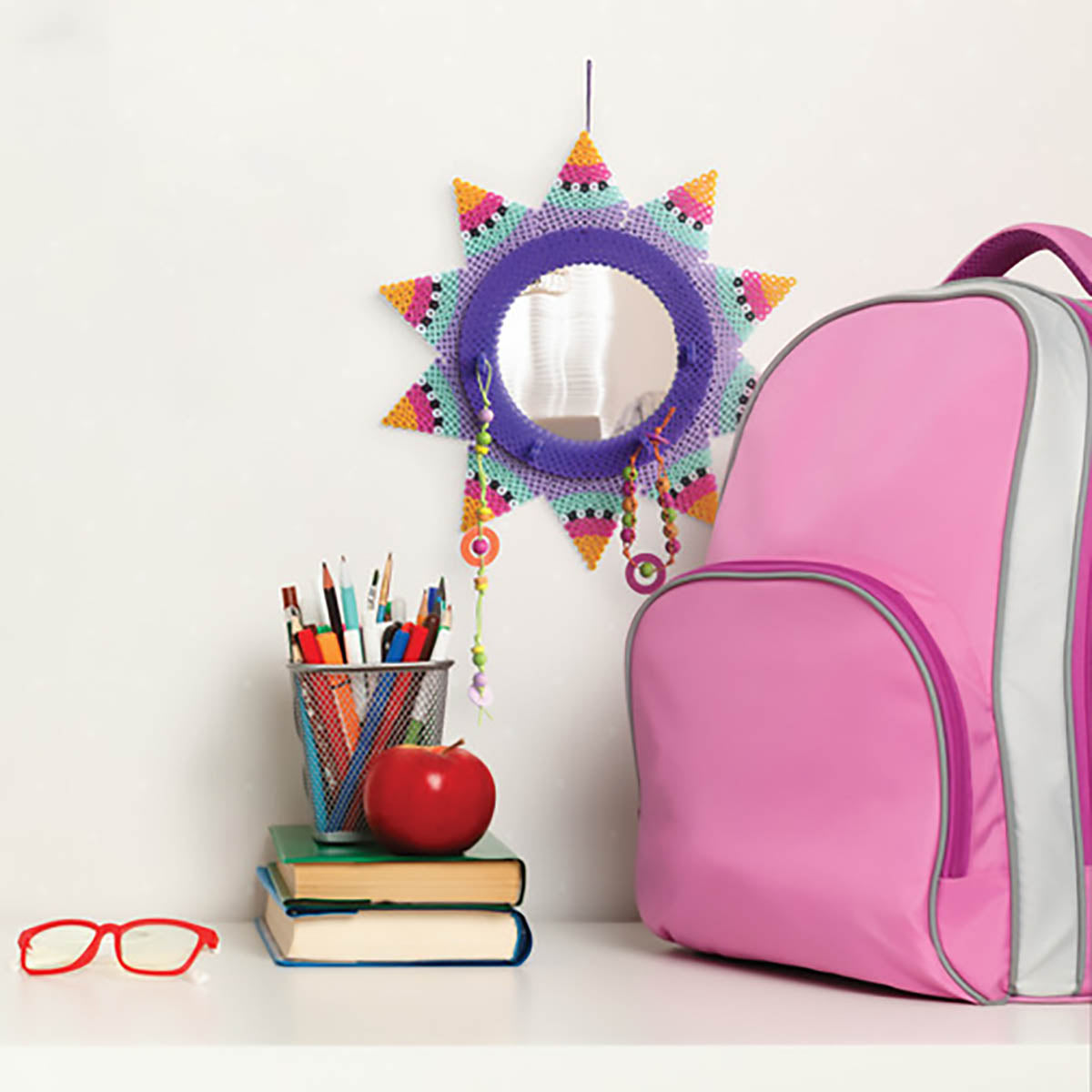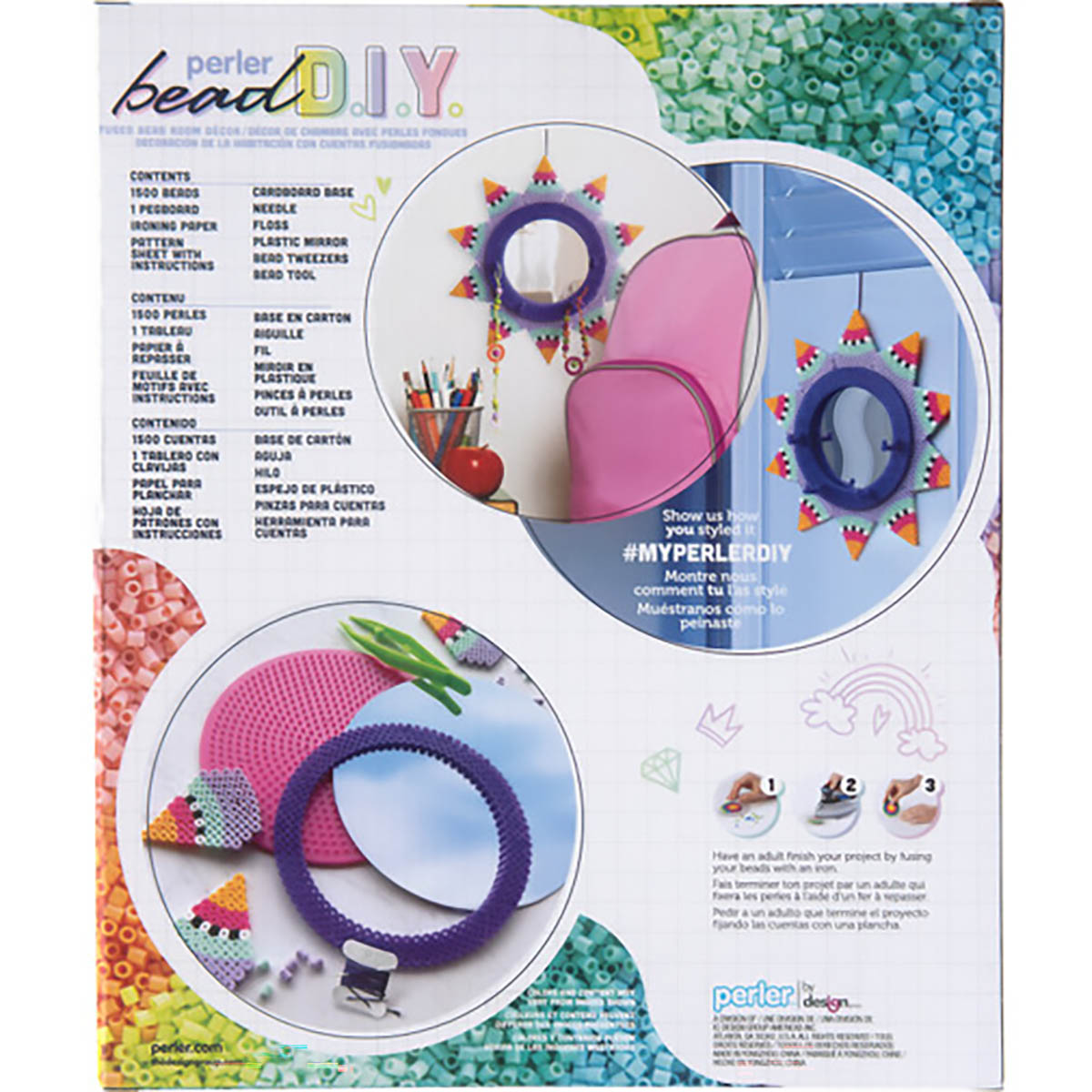 Create this piece of room décor that's both fun and functional using Perler fuse beads. It's a jewelry organizer and mirror all in one! Finished size of organizer is 9.5 x 9.5 inches. For ages 8 and up. Kit contains 1500 beads, pegboard (large circle), pattern sheet with instructions, ironing paper, bead tweezers, bead tool, plastic mirror, cardboard base, needle, and floss. Ironing to be done by an adult only.