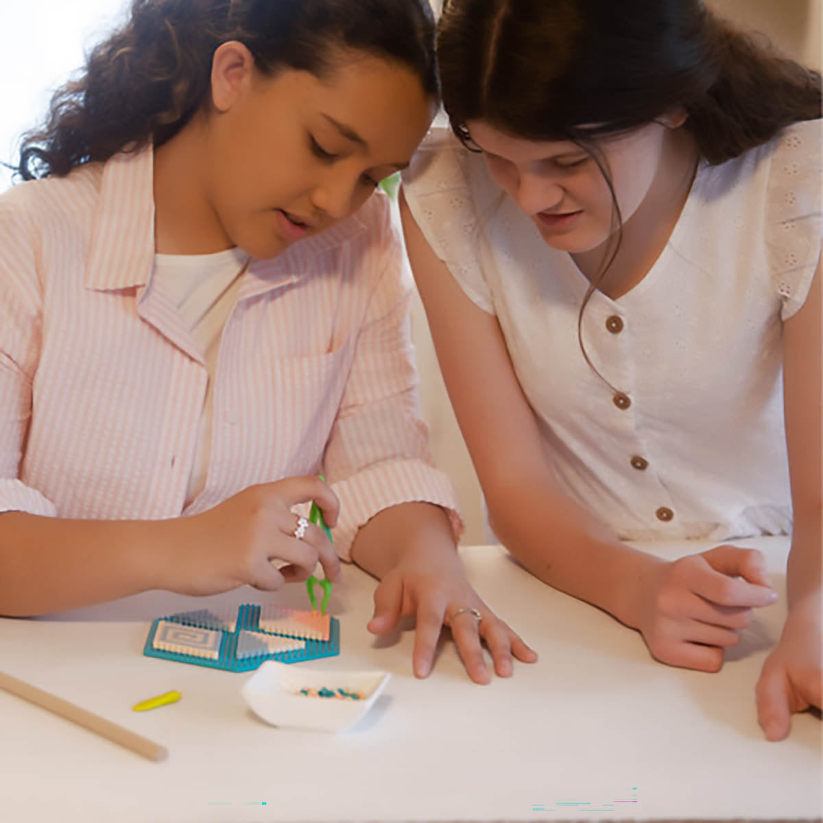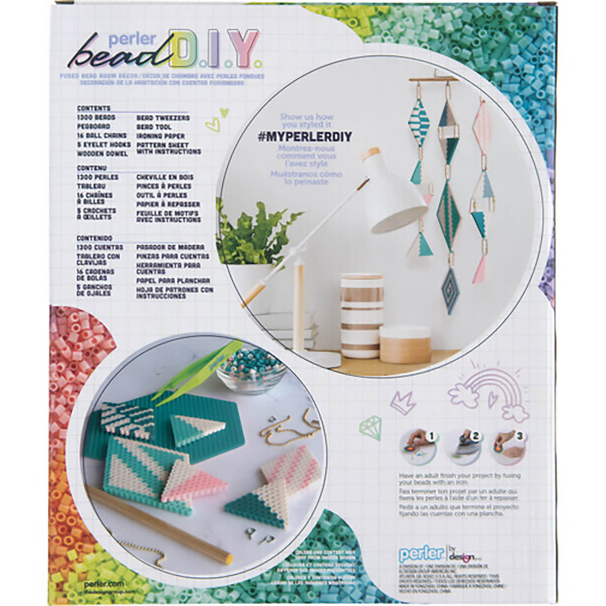 This geometric mobile made from Perler fuse beads will make a great accent for your room. It's fun and easy to create this kinetic bead art and you can change the configuration anytime you like! Finished size approx. 9 x 15 inches. For ages 8 and up. Kit contains 1300 beads, pegboard (large hexagon), pattern sheet with instructions, ironing paper, bead tweezers, bead tool, wooden dowel, 16 ball chains, and 5 eyelet hooks. Ironing to be done by an adult only.