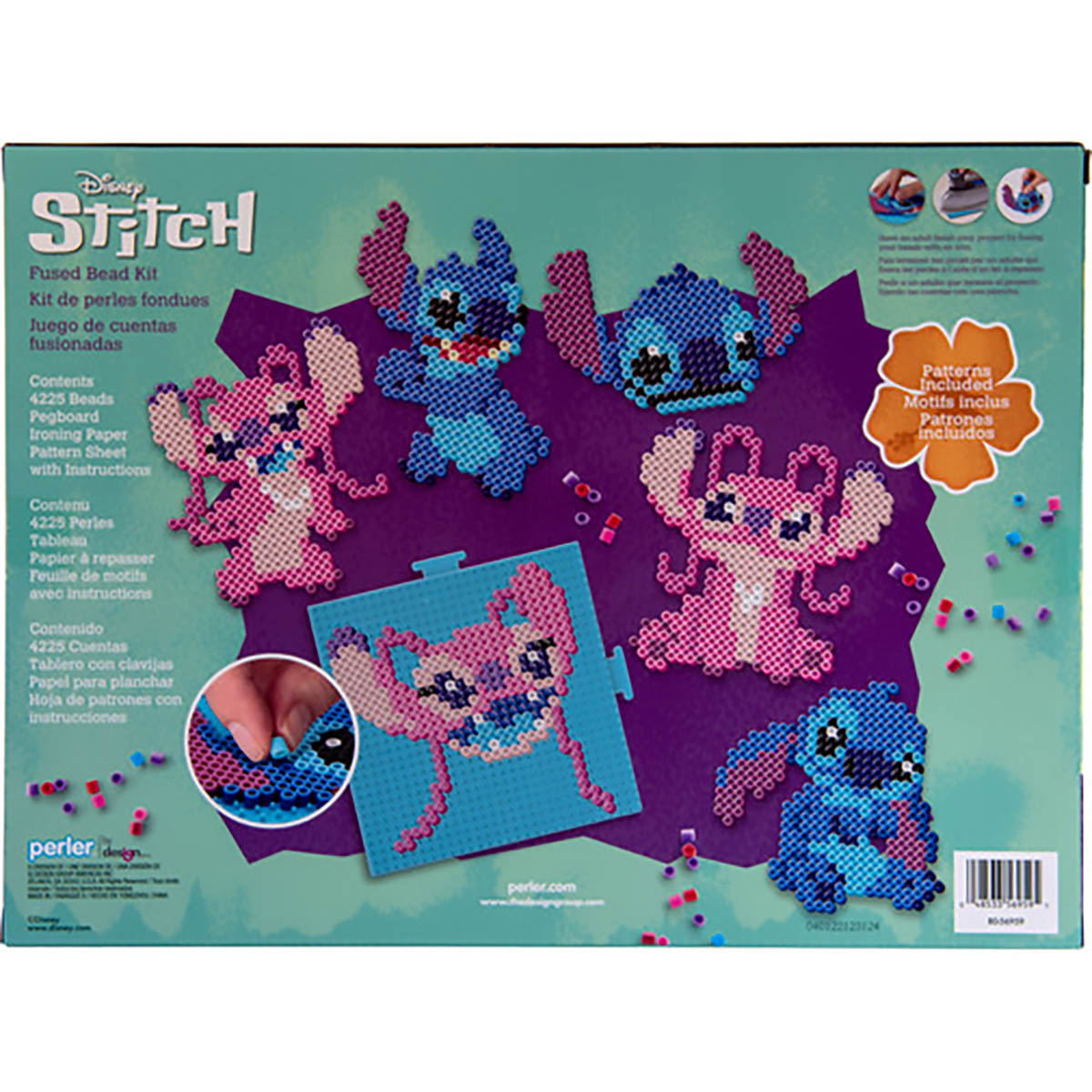 Use Perler fusible beads to create Disney's mischievous Stitch and Angel in various forms. Patterns included to make 10 projects in all! Perler beads are great for promoting fine motor skills, color recognition, and imaginative play. Designed for ages 6 and up. Kit contains 4225 beads, pegboard (large interlocking square), pattern sheet with instructions, and ironing paper. Pegboard and ironing paper are reusable. © Disney. www.disney.com