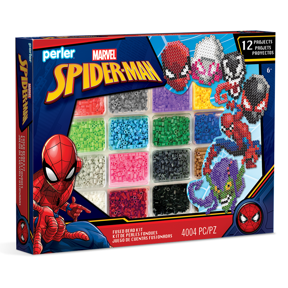 This fused bead kit is perfect for fans of Marvel's Spider-Man. Includes patterns to create 12 projects, including the superhero himself and some of his archenemies. Designed for ages 6 and up. Kit contains 4550 beads, pegboard (large interlocking square), pattern sheet with instructions, and ironing paper. Pegboard and ironing paper are reusable. © Marvel.