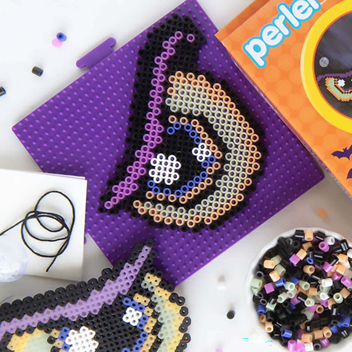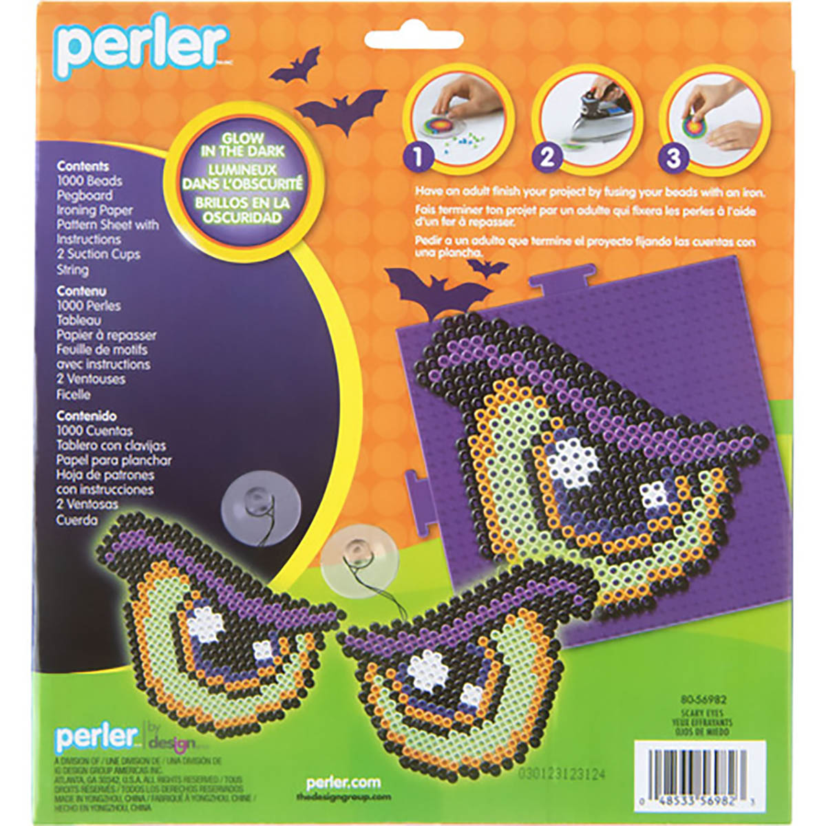 Have a spooktacular time creating these scary eyes with fuse beads. Display them in a window and they're sure to create a little fright for the trick or treaters who come to your house on Halloween. The finished designs are easy to display using the included string and suction cups. Designed for ages 6 and up. Kit contains 1000 beads, 1 pegboard (large square), 2 suction cups, string, pattern sheet with instructions, and ironing paper. Pegboard and ironing paper are reusable.